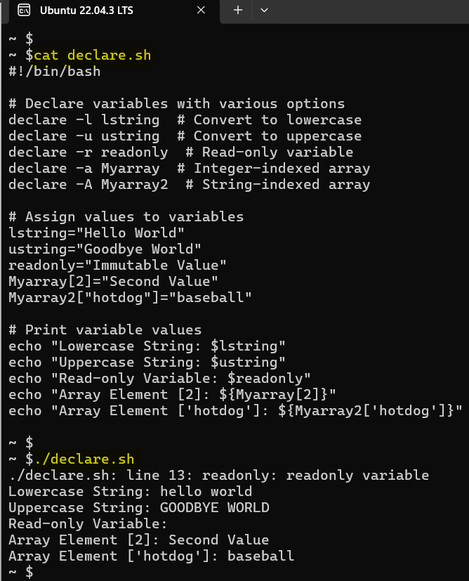 In this script, we utilize declare to specify variable properties, such as lowercase and uppercase conversions, read-only status, and array indexing methods. Subsequently, we assign values to these variables and demonstrate their behavior through echo statements.