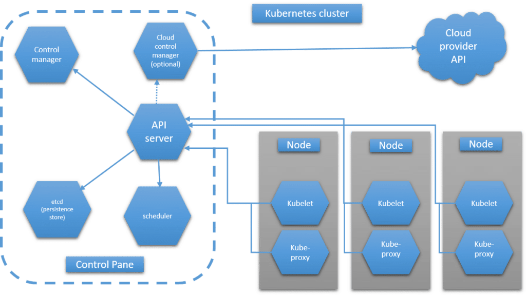 - Cluster: A Kubernetes cluster comprises a collection of nodes responsible for hosting the containers. Typically, a cluster consists of a master node that manages the cluster and multiple worker nodes where the containers run.