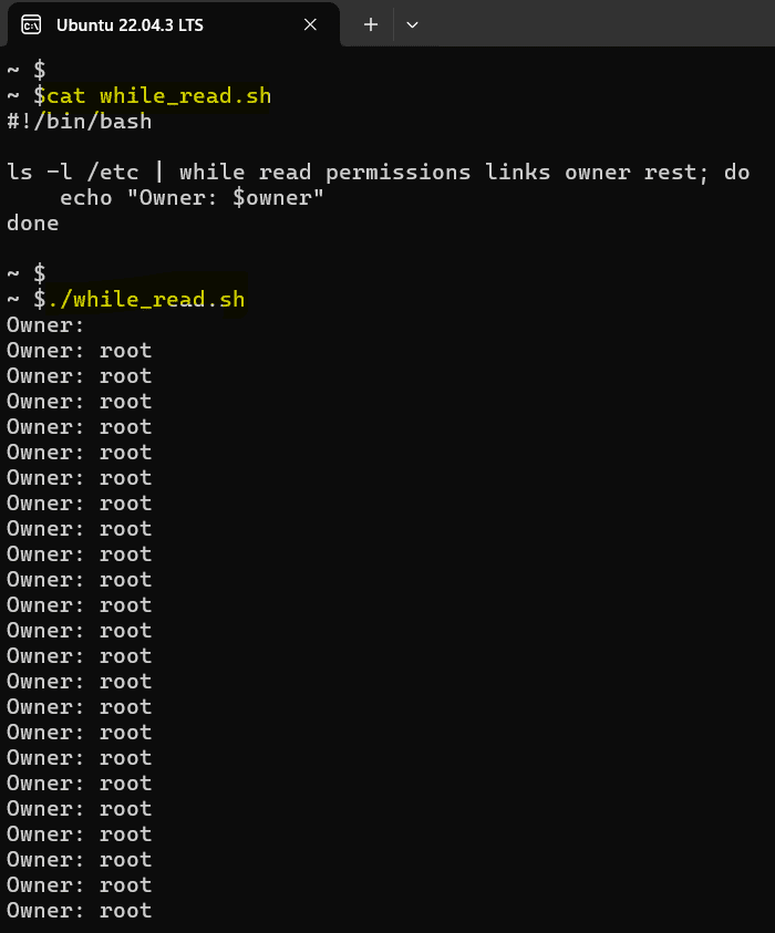In this example, the script retrieves the output of ls -l /etc and pipes it into a while loop. Within each iteration, the read command extracts the permissions, link count, owner, and remaining information from each line of output. The script then prints the owner of each file or directory in the /etc directory.