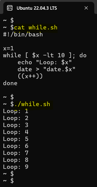 In this script, the loop iterates as long as the value of $x is less than 10. Within each iteration, it echoes the loop count and runs the date command, saving the output to a file named date.x. This illustrates how while loops can be utilized for repetitive tasks with numeric conditions.